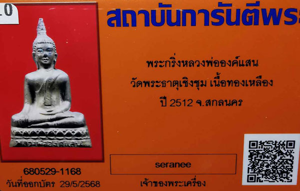 พระกริ่งหลวงพ่อองค์แสน วัดพระธาตุเชิงชุม เนื้อทองเหลือง กริ่งดัง ปี2512 จ.สกลนคร + บัตรG-pra สภาพเดิมค่ะ สภาพตามรูปทุกประการค่ะ