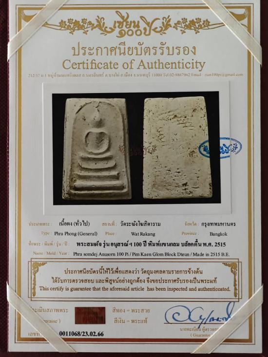 พระสมเด็จ รุ่น อนุสรณ์ฯ100ปี พิมพ์แขนกลม บล็อคตื้น ปี 2515 พร้อมประกาศนียบัตรรับรอง