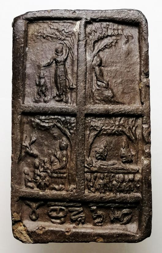 พระคันธราช (หลังปางประสูติ,ตรัสรู้,ปฐมเทศนา,ปรินิพพาน) คุณแม่บุญเรือน เนื้อดิน วัดสารนารถ จ.ระยอง สร้างปี2506 โซนเนื้อสีเทาเข้ม