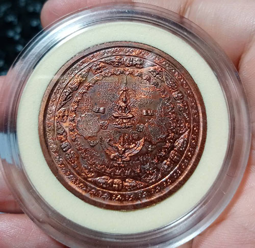 เหรียญกลม โดยด้านหน้าเป็นพระบรมรูปเสด็จพ่อ ร.5 ครึ่งพระองค์ ทรงพระมาลาสูง และ ยันต์เทพเทวานิมิต โดยมียันต์ช้างสามเศียรล้อมองค์ด้านนอก สำหรับด้านหลังมีพระศรีอริยเมตตรัยประทับเหนือพญาครุฑ และล้อมรอบด้วยยันต์พญาครุฑ เป็นเหรียญที่มีพุทธคุณสูงมากในเรื่องบารมีมหาอำนาจ มีผลในเรื่องการทำงานดีมากครับ เป็นอีกเหรียญหนึ่งที่น่าใช้และน่าสะสมเป็นอย่างยิ่งครับ |
