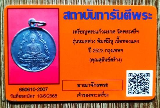 เหรียญพระแก้วมรกต วัดพระศรีฯ รุ่นหมดห่วง เนื้อทองแดง ปี 2523 ( คุณสุธันย์สร้าง ) กรุงเทพฯ ( พิมพ์มีหู สร้างแค่ 200 เหรียญ ) เหรียญรุ่นนี้ปลุกเสกโดย หลวงพ่อเกษม เขมโก และหลวงปู่ดู่ วัดสะแก พร้อมมบัตร