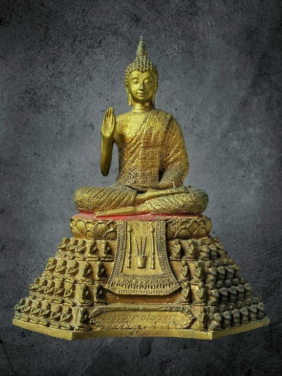 พระบูชา พระพุทธโอวาท จัดสร้างโดย จตุเสนาสมาคม พิธีพุทธาภิเษกใหญ่ ศิลป์สวยงาม ฐานพระอัครสาวกรายล้อม ป้ายด้านหลังครบ กะไหล่ทองผิวหิ้งเดิม