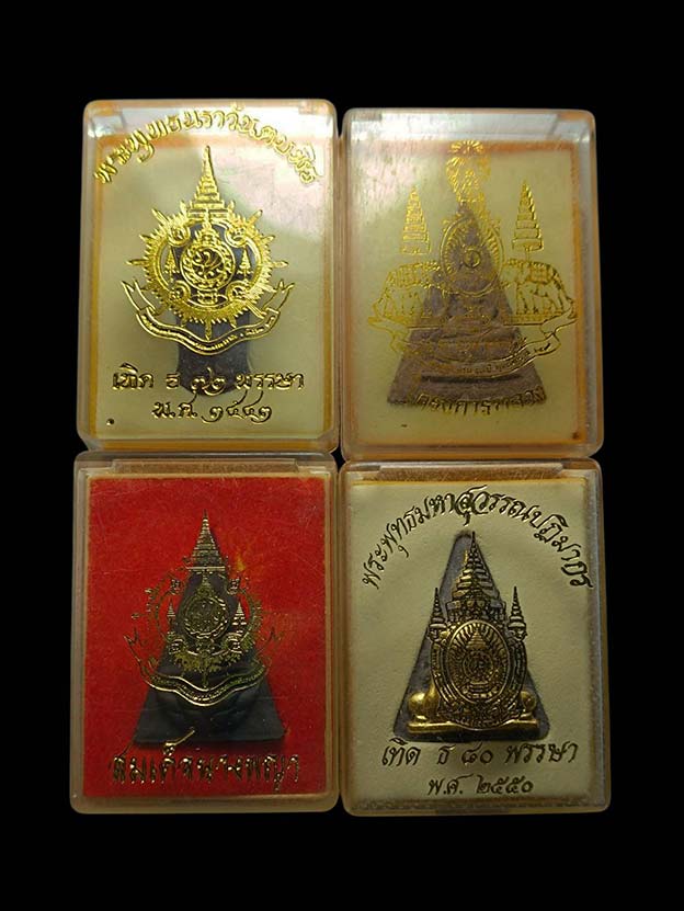 พระเครื่อง จำนวน 4 องค์ เนื้อผง ในหลวงรัชการที่ 9 พระพุทธนราวันตบพิธ ผสมผงจิตรลดา, สมเด็จนางพญา (พิมพ์พระกำลังแผ่นดิน), พระพุทธนวราชบพิตร พิมพ์จิตรลดา โครงการหลวง, พระพุทธมหาสุวรรณปฏิมากร วัดไตรมิตรวิทยาราม เทิด ธ 80 พรรษา