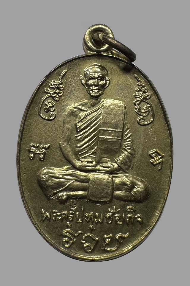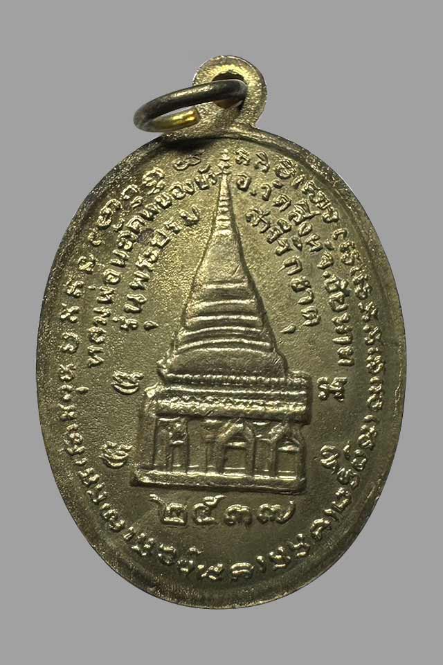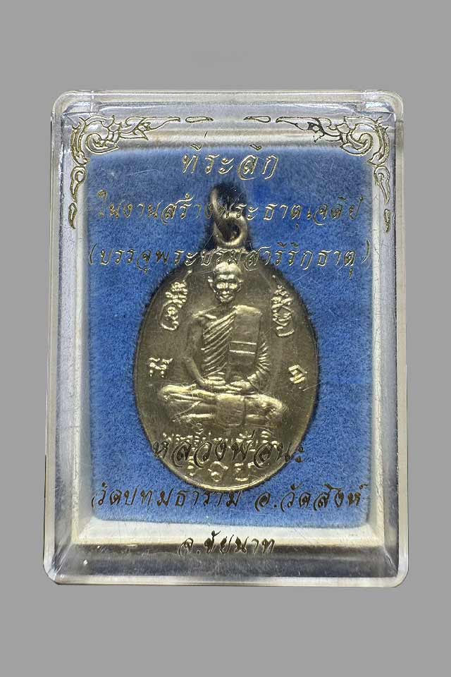 เหรียญพระครูปทุมชัยกิจ (หลวงพ่อนะ) วัดปทุมธาราม (วัดหนองบัว) จ.ชัยนาท รุ่นที่ระลึกในการสร้างพระธาตุเจดีย์ (บรรจุพระบรมสารีริกธาตุ) เนื้อทองฝาบาตร ปี 2537 |