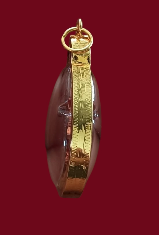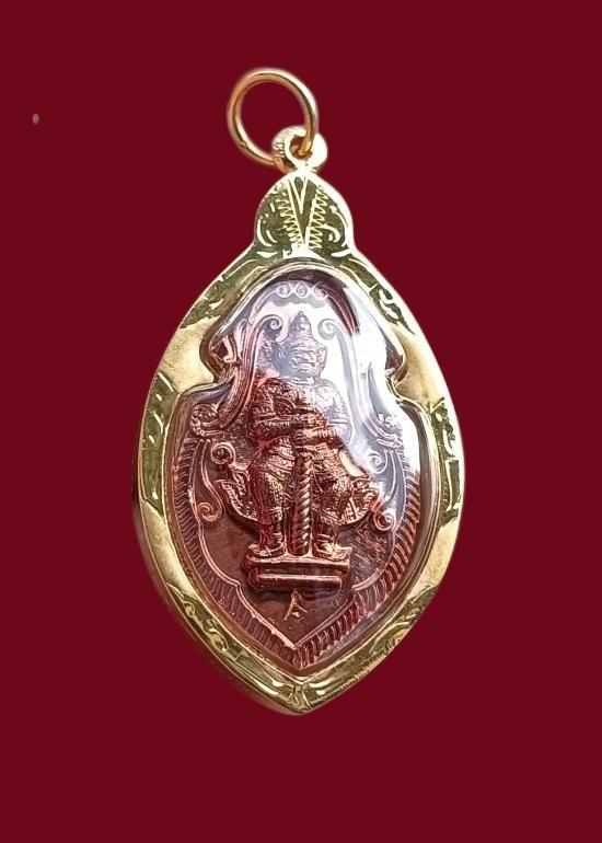 เหรียญท้าวเวสสุวรรณ หลวงพ่ออิฏฐ์ พิมพ์ใบสาเก เนื้อทองแดง ปี 59 เลี่ยมทองคำ 75%