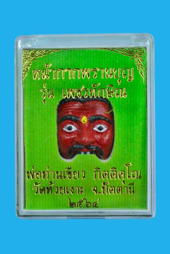 หน้าพราน รุ่นเพชร ทักษิณ เนื้อโลหะ หน้า แดง * หน้าพรานชุดนี้ ด้านหลังมีจีวรเกศา * หลวงปู่เขียว มีตะกรุดเงินจารมือ. มีไม้รอดโบสถ์ |