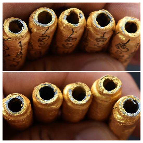 ชุด 5 ดอก...ตะกรุดกาคาบทรัพย์ ปี 2554 หลวงปู่น้อย วัดบ่อหลวง จ.เพชรบุรี พร้อมซองเดิมจากวัด สภาพพระตามรูปทุกประการ ( ทาทองจารยันต์ ขนาดยาว 2 นิ้ว )