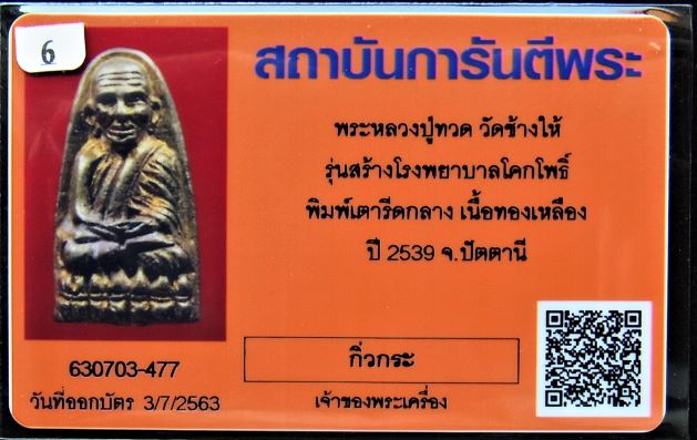 หลวงปู่ทวด พิมพ์เตารีดกลาง วัดช้างให้ เนื้อทองเหลือง สร้างโรงพยาบาลโคกโพธิ์ จ.ปัตตานี ปี 2539 กล่องเดิม+บัตรรับรอง |