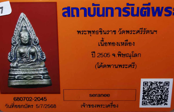 พระพุทธชินราช วัดพระศรีรัตนฯ เนื้อทองเหลือง(โค๊ตก้นพานพระศรี) ปี2505 จ.พิษณุโลก + บัตร G-pra สภาพเดิมค่ะ สภาพตามรูปทุกประการค่ะ