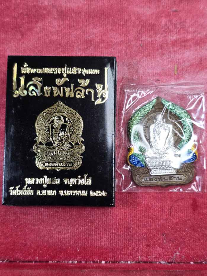 นั่งพานแสงพันล้าน เนื้อนวะโลหะหน้ากากเงินฝังพลอย เลข 354 แยกชุดกรรมการ หลวงปู่แสง วัดโพธิ์ชัย ปี 62 พร้อมกล่องเดิม |