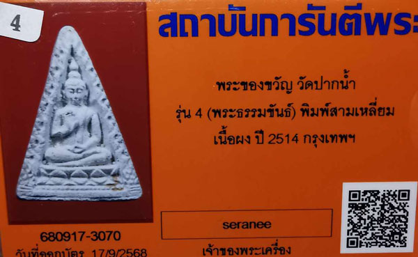 พระของขวัญ วัดปากน้ำ รุ่น4(พระธรรมขันธ์) พิมพ์สามเหลี่ยม เนื้อผง ปี2514 กทม + บัตรG-pra สภาพเดิมค่ะ สภาพตามรูปทุกประการค่ะ