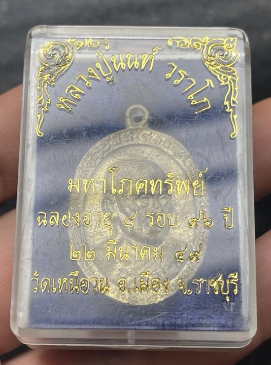 เหรียญหล่อหลวงปู่นนท์ วราโภ วัดเหนือวนราชบุรีปี2549 รุ่นมหาโภคทรัพย์ เนื้อทองทิพย์ บรรจุเกศา สภาพสวย มาพร้อมกล่องเดิมๆ |