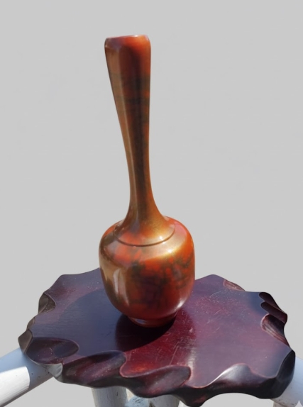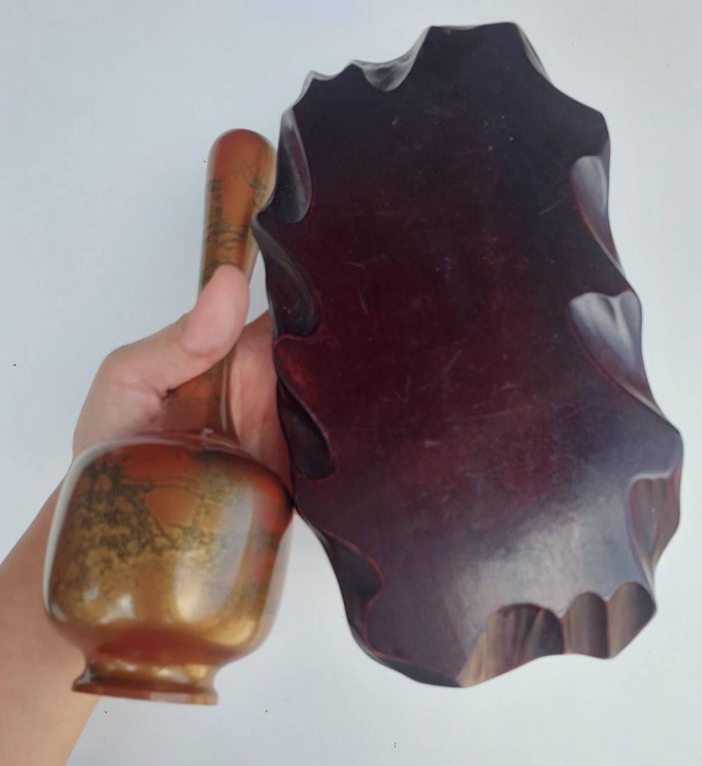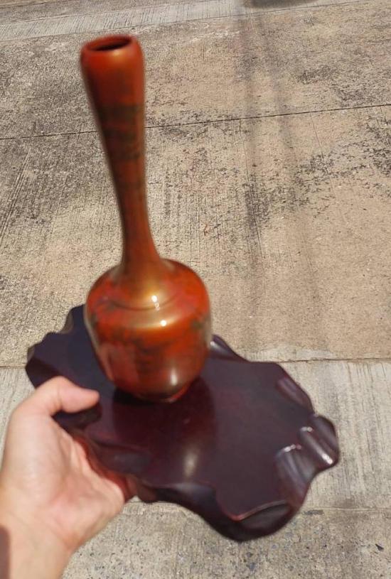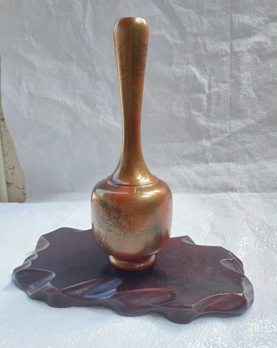 ***วัดใจ***แจกันเก่าเก็บเนื้อทองเหลืองลงยา (มูราชิโด)งานของญี่ปุ่น สีส้ม ลายทอง สูง 9 นิ้ว กับแท่นวางเนื้อไม้ สวยๆ |