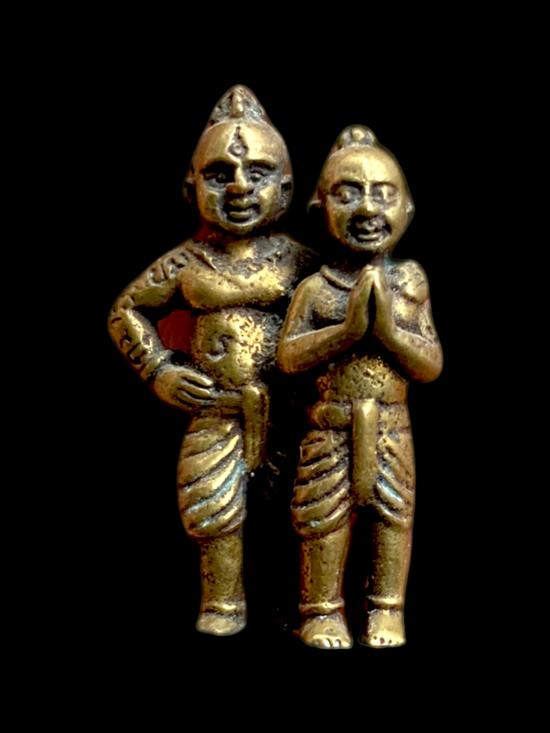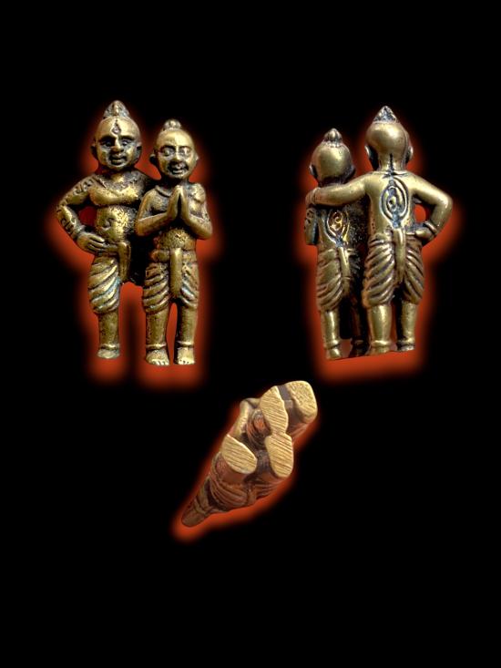 กุมารทองแฝดคู่ หลวงพ่อดำ วัดสันติธรรม เนื้อโลหะเก่าจัด แกะพิมพ์ได้อ่อนช้อยงดงาม แสดงถึงความผูกพันของกุมารคู่พี่น้ององค์หนึ่งยกมือไหว้ อีกองค์เท้าค้ำเอว เสมือนคอยเกื้อกูลกันและกัน พลังเมตตามหานิยมแรงมาก เหมาะสำหรับพ่อค้าแม่ค้า หรือผู้ต้องการเสริมดวงค้าขาย เรียกลูกค้าให้เข้าหาไม่ขาดสาย