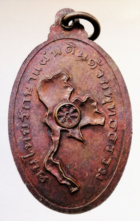 เหรียญสมเด็จพระนเรศวรมหาราช ด้านหลังเป้นรูปแผ่นที่ประเทศไทย ระบุคำว่า คนไทยรักษาแผ่นดินด้วยพุทธธรรม อธิษฐานจิตโดย หลวงพ่อจรัญ วัดอัพวัน ปี2533 เป็นเหรียญที่ประสบการณ์มากมาย มีประวัติเรื่องราวที่น่าสนใจ ยิ่งเป็นเนื้อทองแดงรมน้ำตาลเดิม ๆ สภาพสวยตรงตามรูป