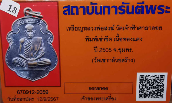 เหรียญหลวงพ่อสงฆ์ วัดเจ้าฟ้าศาลาลอย พิมพ์เข่าขีด เนื้อทองแดง ห่วงเดิม ปี2505 จ.ชุมพร(วัดเขากล้วยสร้าง)+ บัตรG-pra สภาพเดิมค่ะ |