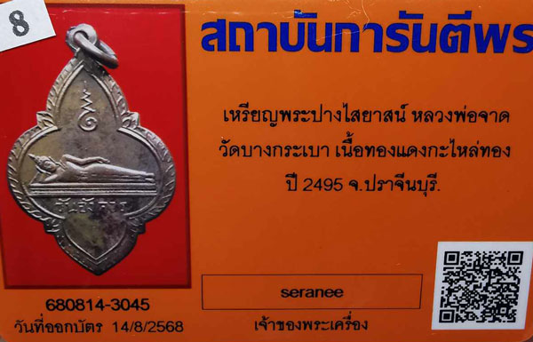 (วันอังคาร)เหรียญพระปางไสยาสน์ หลวงพ่อจาด วัดบางกระเบา เนื้อทองแดงกะไหล่ทอง ห่วงเดิม ปี2495 จ.ปราจีนบุรี + บัตรG-pra สภาพสวยเดิมค่ะ สภาพตามรูปทุกประการค่ะ |