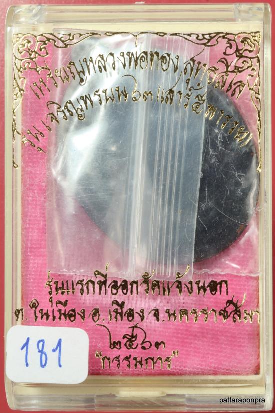 เหรียญหลวงพ่อทอง รุ่นเจริญพรบน๖๓ ปี 2563 เนื้อทองแดงรมดำไม่ตักปีกหลังเรียบ หมายเลข 181 |