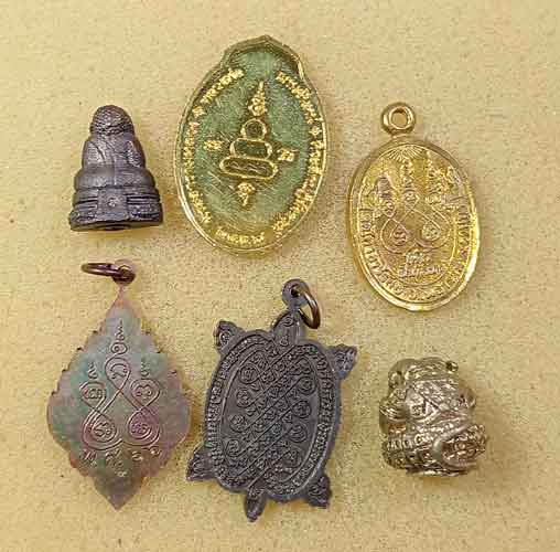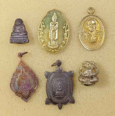 รูปหล่อกริ่งพระสังกัจจายน์ วัดพิกุลทอง ราชบุรี +หลวงพ่อกุหลาบ วัดไทรอารีรักษ์ +เหรียญวัดช่องลม +เหรียญวัดขนอน+ เต่า วัดหนองกระทุ่ม +ลูกอมเสือ วัดชาวเหนือ ราชบุรี |