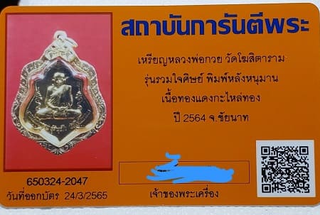 เหรียญหลวงพ่อกวย วัดโฆสิตาราม รุ่นรวมใจศิษย์ ปี 2564 บล็อคหลังยันต์หนุมาน กะไหล่ทอง สวยมากเลี่ยมพร้อมกรอบพร้อมใช้ พร้อมบัตร G-Pra(ไม่ใช่กรอบทองคำนะครับ) สวยคมชัด เดิม พร้อมกล่องเดิม |