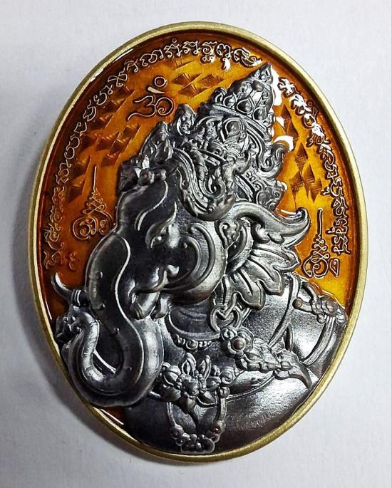 เหรียญพระพิฆเนศ รุ่น อิ่มทรัพย์ -- หลวงปู่อิ่ม วัดทุ่งนาใหม่ -- ทองทิพย์ซาตินลงยาส้ม หน้ากากนวะ หลังหน้ากากพระพรหมนวะ เลข ๓๓ -- |