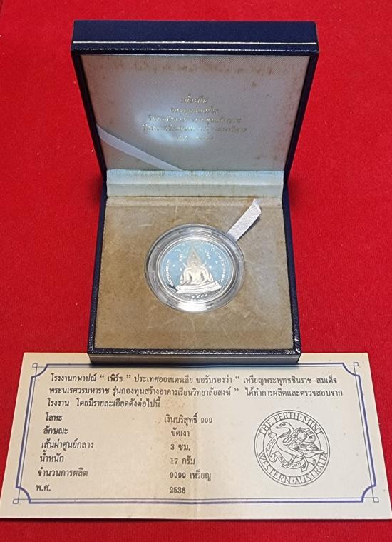 เหรียญพระพุทธชินราช หลังสมเด็จพระนเรศวรมหาราช โรงงานกษาปณ์ "เพิร์ธ" ปี 2536 เนื้อเงินบริสุทธิ์ 999 พร้อมกล่องเดิม