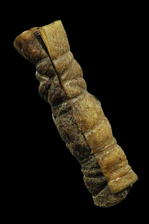 ตะกรุดหนังเสือเก่ายาว 1.6 นิ้วไม่ทราบเกจิ ทีแผ่นตะกรุดอยู่ด้านใน