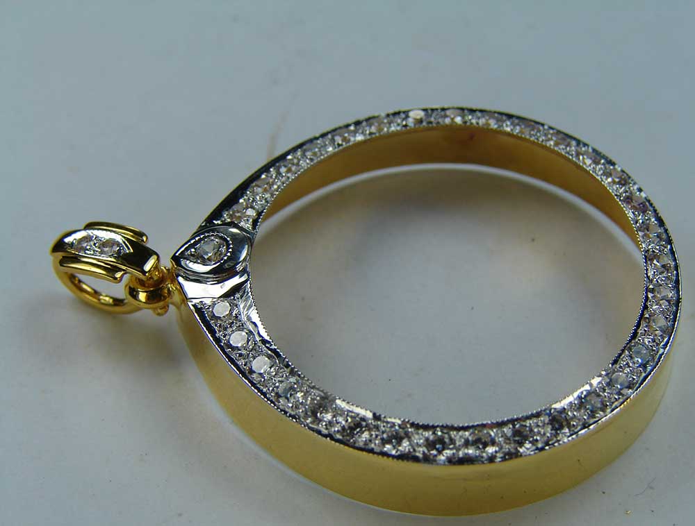 กรอบทองคำ ล้อมเพชร ห่วงเพชร ทรงกลม ขนาด เส้นผ่าศูนย์ กลาง ขอบใน 2.5 ซม. ใส่ ลูกอม หรือไซด์ไกล้เคียง ( ฝังเพชร CZ 36 เม็ด ) ชุบหน้าขาว งานขึ้นมือ น้ำหนัก 3.68 กรัม เปอร์เซ็นต์ทอง 63-70 เปอร์เซ็นต์ รับป |