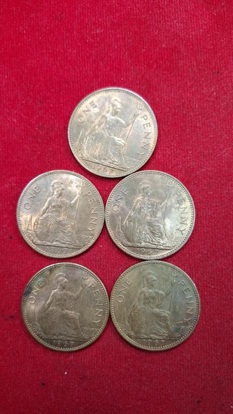 เหรียญ 1 เพนนีของอังกฤษที่ผลิตในปี 1967 ด้านหน้าเหรียญเป็นรูปสมเด็จพระราชินีนาถเอลิซาเบธที่ 2 และด้านหลังเป็นรูปบริทานเนีย (Britannia) ซึ่งเป็นสัญลักษณ์ของสหราชอาณาจักร สภาพสวย ทั้งหมด5เหรียญ |