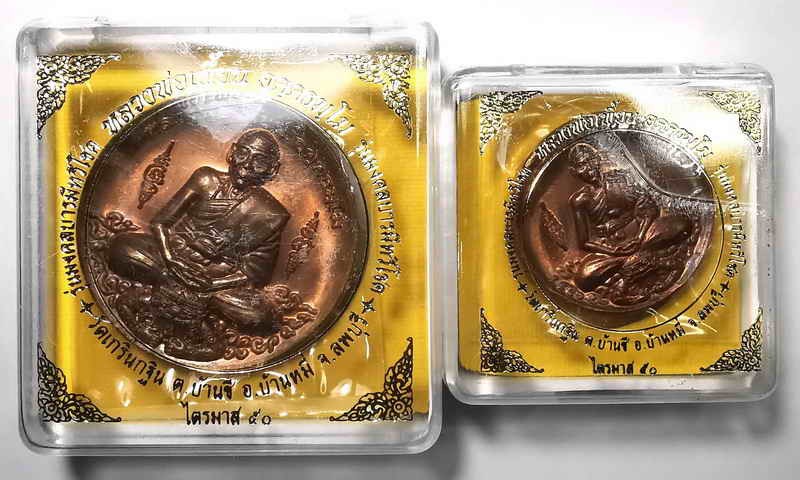 ( เคาะเดียว 2 เหรียญ พร้อมกล่องเดิม ) เหรียญหลวงพ่อเพี้ยน มงคลบารมี ทวีโชค เนื้อทองแดง พิมพ์ใหญ่ 4.5 ซ.ม. + พิมพ์เล็ก 3.2 ซ.ม. วัดเกริ่นกฐิน จ.ลพบุรี ไตรมาส ปี 2550 มีโค๊ตและหมายเลข(ขอบเหรียญ) ทุกเหรี |