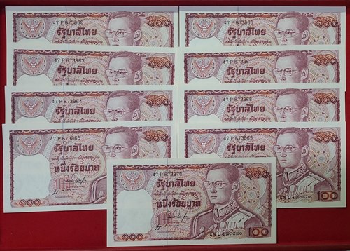 ธนบัตร 100 บาท ในหลวงรัชกาลที่ 9 แบบ 12 ด้านหลังช้างแดง เลข 6 หลัก หายาก เลขเรียง จำนวน 9 ฉบับ สภาพ UNC ใหม่,ไม่ได้ใช้,ไม่มีรอยพับ ลายเซ็น สมหมาย ฮุนตระกูล - นุกูล ประจวบเหมาะ |