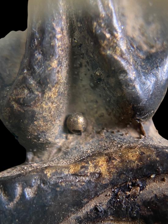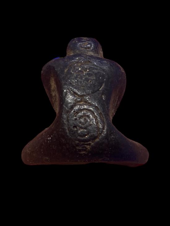 พระปิดตาแกะจากไม้เก่า องค์นี้เป็นของหายากมากในสายเครื่องราง เนื้อไม้มีอายุสูง ผิวแห้งธรรมชาติ มีรอยสัมผัสและการใช้จริงมานาน จุดเด่นคือรอยจารยันต์ด้านหลังและเม็ดมวลสารฝังในองค์ สื่อถึงการปลุกเสกแบบโบราณ องค์เล็กแต่เปี่ยมพลัง