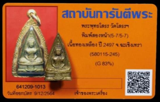 พระพุทธโสธร วัดโสธรฯ พิมพ์สองหน้า ปี 2497 พระศก 5-7/5-7 วงแหวนติดบางๆ ครับ เนื้อทองเหลือง จ.ฉะเชิงเทรา สวยเดิมครับ พร้อมบัตรรับรองการันตีครับ (ไม่มีกรอบทองนะครับ) |