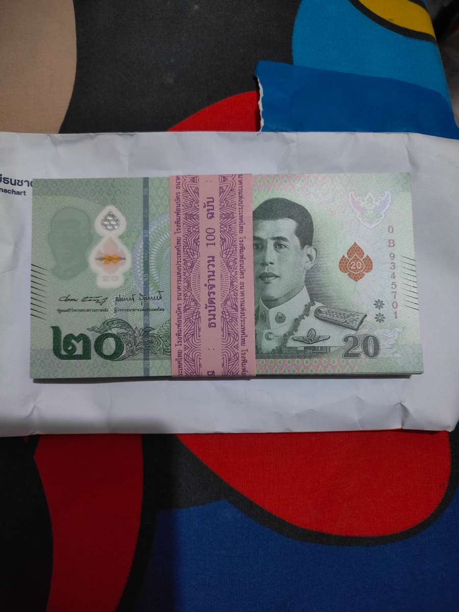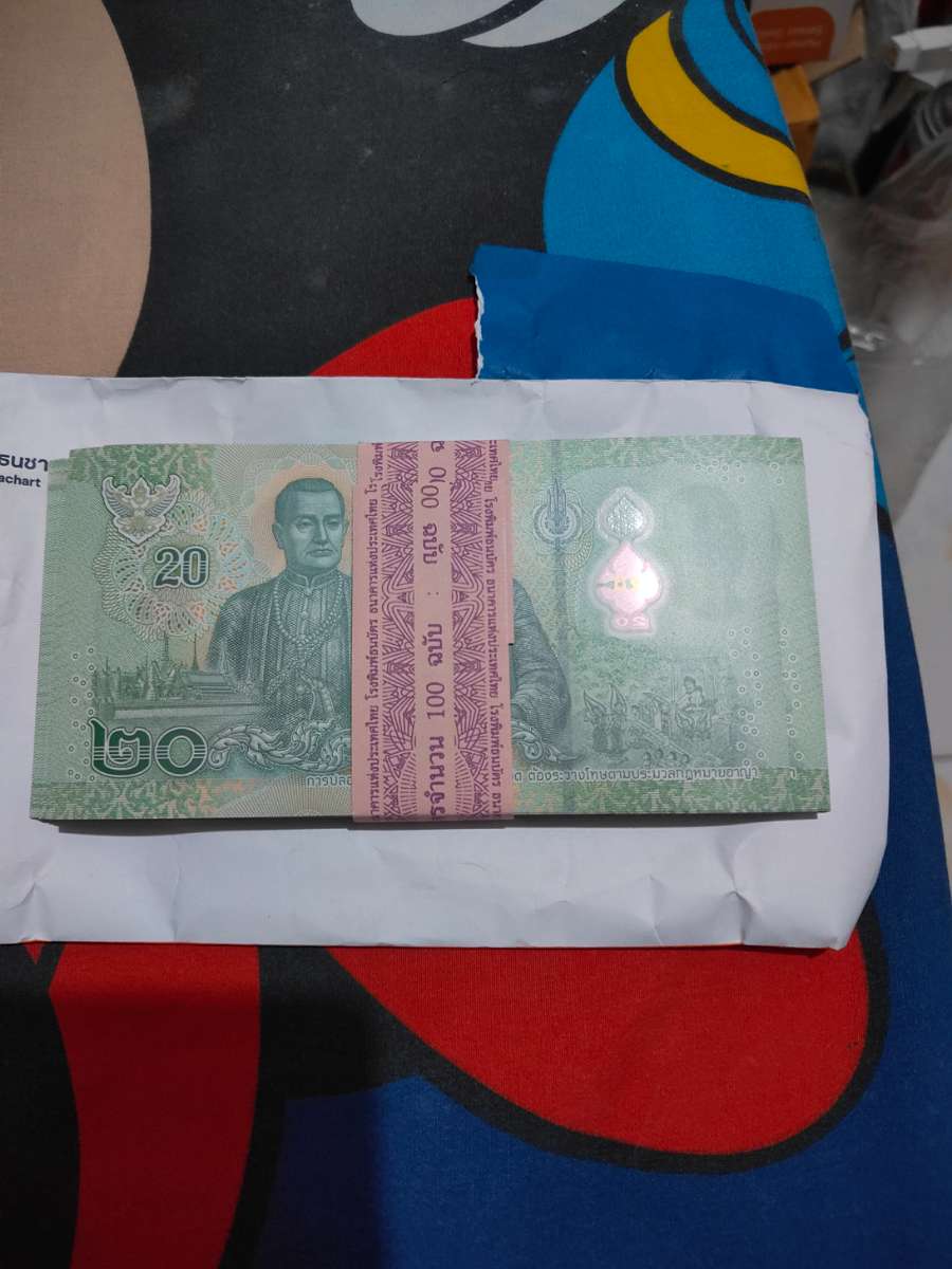 ธนบัตร 20 บาท จำนวน 99 ฉบับแนบเดิมๆ ใหม่ๆ ไม่ผ่านการใช้ เลขเรียงกันทั้งหมด