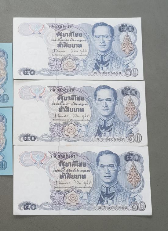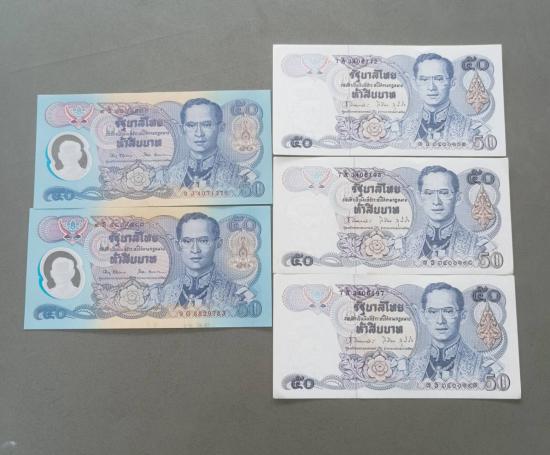 ธนบัตร 50 บาท กาญจนา จำนวน 2 ใบ ธนบัตร 50 บาท แบบที่ 13 จำนวน 3 ใบ ไม่ผ่านการใชั |
