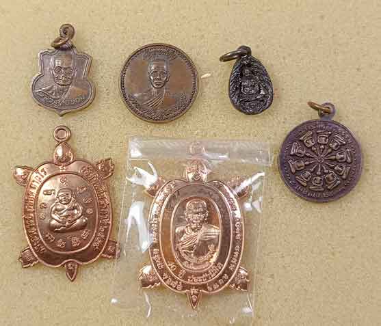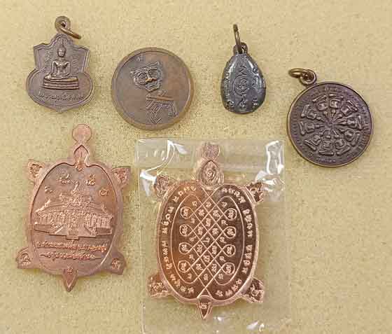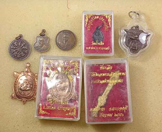 เหรียญลพ.ขอม+ อ.เล็ก วัดดอนชาด สุพรรณฯ+เหรียญลพ.ชื่น วัดถ้ำเสือ กาญจนฯ+เต่าอ.สมคิด วัดหินแท่นลำภาชี +เต่าลพ.ชุบ วัดวังกระแจะ+หน้าเสือ วัดองค์พระ สุพรรณฯ+เหรียญวัดดอนหอคอย+เครื่องรางวัดเมตตาธรรมโพธิญาณ |