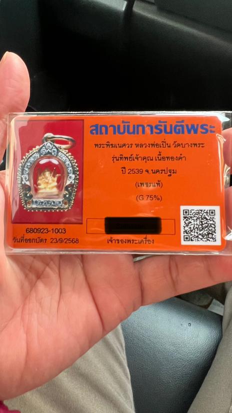 พระพิฆเนศวร หลวงพ่อเปิ่น วัดบางพระ รุ่นทิพย์เจ้าคุณ เนื้อทองคำ พร้อมกรอบทองคำฝังเพชรแท้พร้อมห้อยบูชา น้ำหนักรวม 7.5 กรัม |