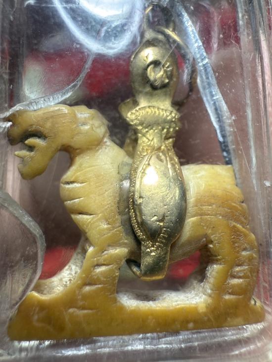 สิงห์งาแกะไม่ทราบที่ ห้อยกระเช้าทองคำแท้(ทองคำโบราณ) เลี่ยมกรอบพลาสติกกันน้ำอีกที เก่ามากครับ สภาพใช้ห่วงทองตำเกือบขาด |