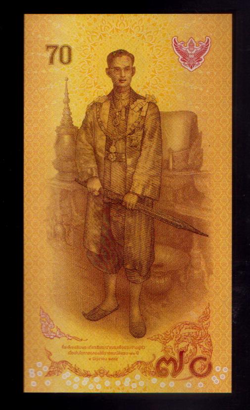 ## ธนบัตรที่ระลึก 70 บาท พระบาทสมเด็จพระเจ้าอยู่หัวรัชกาลที่ 9 ฉลองสิริราชสมบัติครบ 70 ปี ## ไม่ผ่านการใช้ |