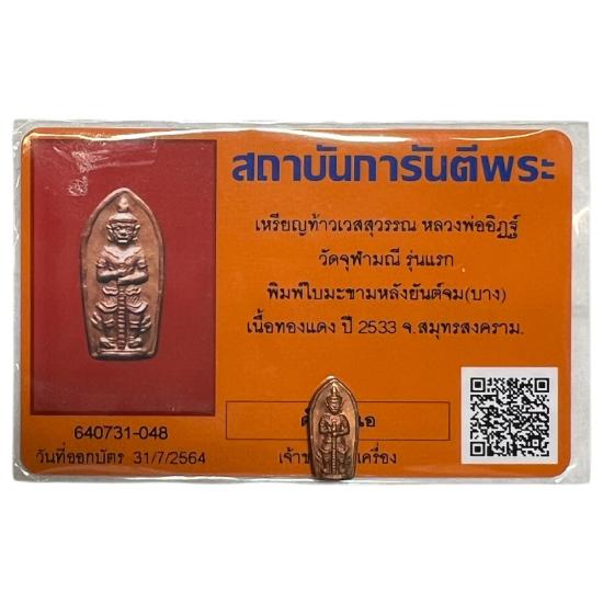 ปรกใบมะขาม ท้าวเวสสุวรรณ รุ่นแรก ยันต์จม บล็อกบาง ปี33 หลวงพ่ออิฎฐ์ วัดจุฬามณี เนื้อทองแดง ผิวไฟแดงเดิม พร้อมบัตร
