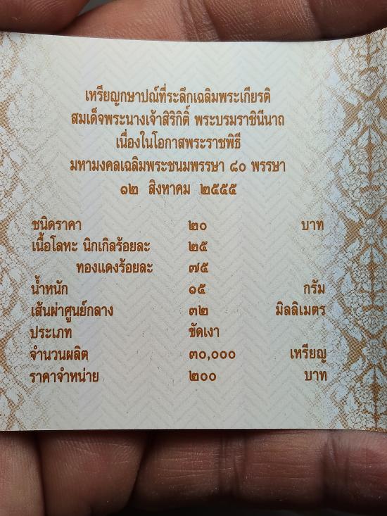 เหรียญกษาปณ์ที่ระลึก สมเด็จพระนางเจ้าสิริกิติ์ มหามงคลเฉลิมพระชนมพรรษา 80 พรรษา ปี 2555 เนื้อนิกเกิลขัดเงา ผิวเดิมๆ พร้อมตลับและใบเซอร์เดิมๆ |