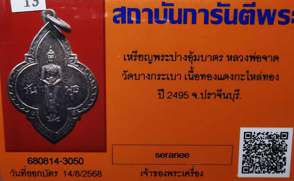 (วันพุธ)เหรียญพระปางอุ้มบาตร หลวงพ่อจาด วัดบางกระเบา เนื้อทองแดงกะไหล่ทอง ห่วงเดิม ปี2495 จ.ปราจีนบุรี + บัตรG-pra สภาพเดิมค่ะ