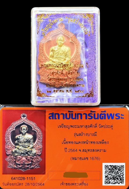 เหรียญสร้างนั่งพานบารมี เนื้อทองแดงหน้าทองเหลือง เบอร์ ๑๖๗๖ ปี 2564 หลวงพ่อพระมหาสุรศักดิ์ วัดประดู่ จ.สมุทรสงคราม พร้อมกล่อง + บัตรรับรองพระแท้การันตีพระ สภาพพระตามรูปที่ลงทุกประการ