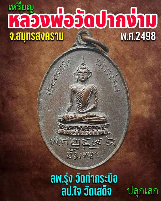 เหรียญหลวงพ่อวัดปากง่าม(วัดพระยาญาติ) สมุทรสงคราม ปี 2498 เหรียญสวย เป็นเหรียญรูปเหมือนองค์พระประธานในโบสถ์วัดปากง่าม เหรียญนี้จัดสร้างขึ้นเมื่อปี 2498 ได้นิมนต์หลวงพ่อรุ่ง วัดท่ากะบือ หลวงพ่อเนื่อง วัดจุฬามณี หลวงปู่ใจวัดเสด็จปลุกเสกพร้อมทั้งเกจิอาจารย์ต่างๆในระแวกนั้น และเหรียญรุ่นนี้ก็ยังได้ลงหนังสือพระเครื่องยอดนิยมของจังหวัดสมุทรสงครามอีก ด้วย นับว่าเป็นของดีพิธีใหญ่จ.สมุทรสงครามครับ |