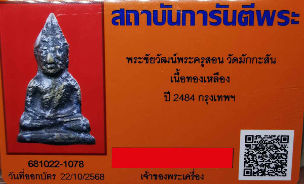 พระชัยวัฒน์พระครูสอน วัดมักกะสัน เนื้อทองเหลือง ปี2484 จ.กรุงเทพฯ + บัตรG-pra สภาพเดิมค่ะ |
