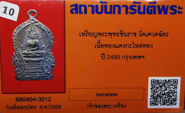 เหรียญพระพุทธชินราช วัดเศวตฉัตร เนื้อทองแดงกะไหล่ทอง ปี2499 จ.กรุงเทพฯ + บัตร G-pra สภาพเดิมค่ะ |