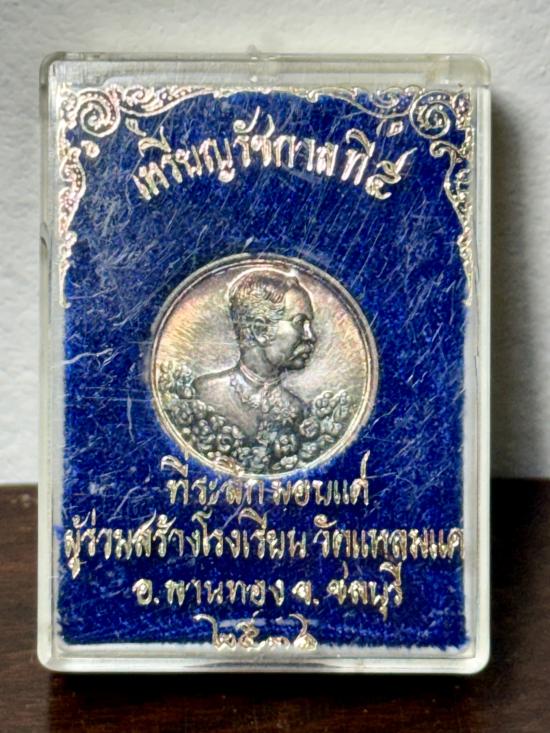 เหรียญ รัชกาลที่ 5 เนื้อเงิน ออกวัดแหลมแค ชลบุรี ปี 2536 พร้อมกล่องครับ