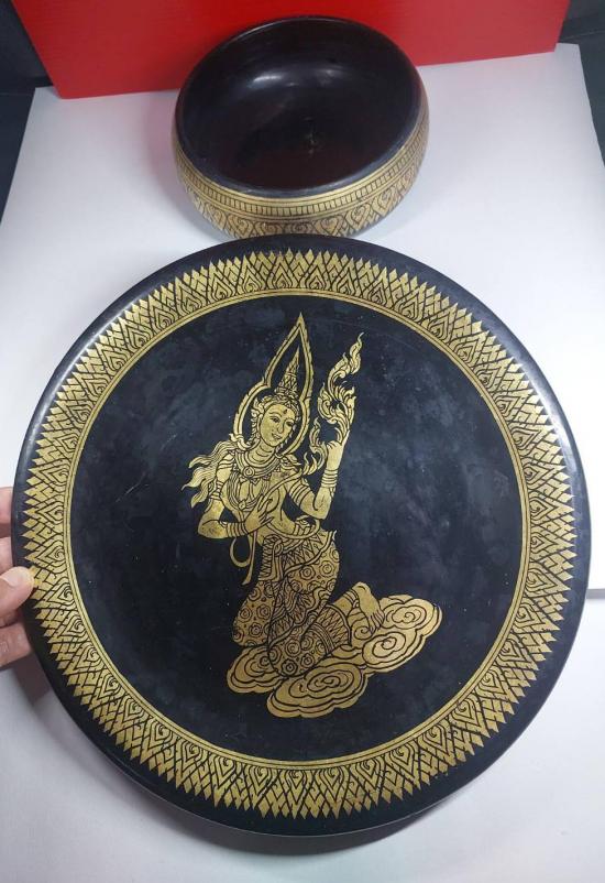 ***วัดใจ***เครื่องเขินลงรักปิดทอง *พระแม่โพสพ* ขนาด 10 นิ้ว พร้อมขันศิลปะลายรดน้ำ ลงรักปิดทอง ขนาด 6 นิ้ว |