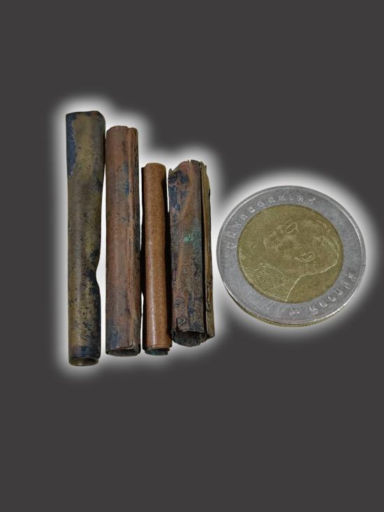 A2538.**วัดใจ** ชุดเซ็ต ตะกรุดทองเเดงเก่า 4 ดอก ไม่ทราบที่ เคาะเดียวเเดง |