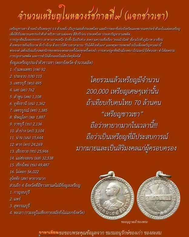 16. ไม่ตอก สุโขทัย (สท) หายากมาก ส่วนอีก 4 จังหวัดที่มีชาวเขาแต่ไม่มีข้อมูลเหรียญ คือ 1.กาญจนบุรี 2.แพร่ 3.สุพรรณบุรี 4.พะเยา (รวมอยู่ใน จ.เชียงราย สมัยนั้นยังไม่แยกออกเป็นจังหวัด)